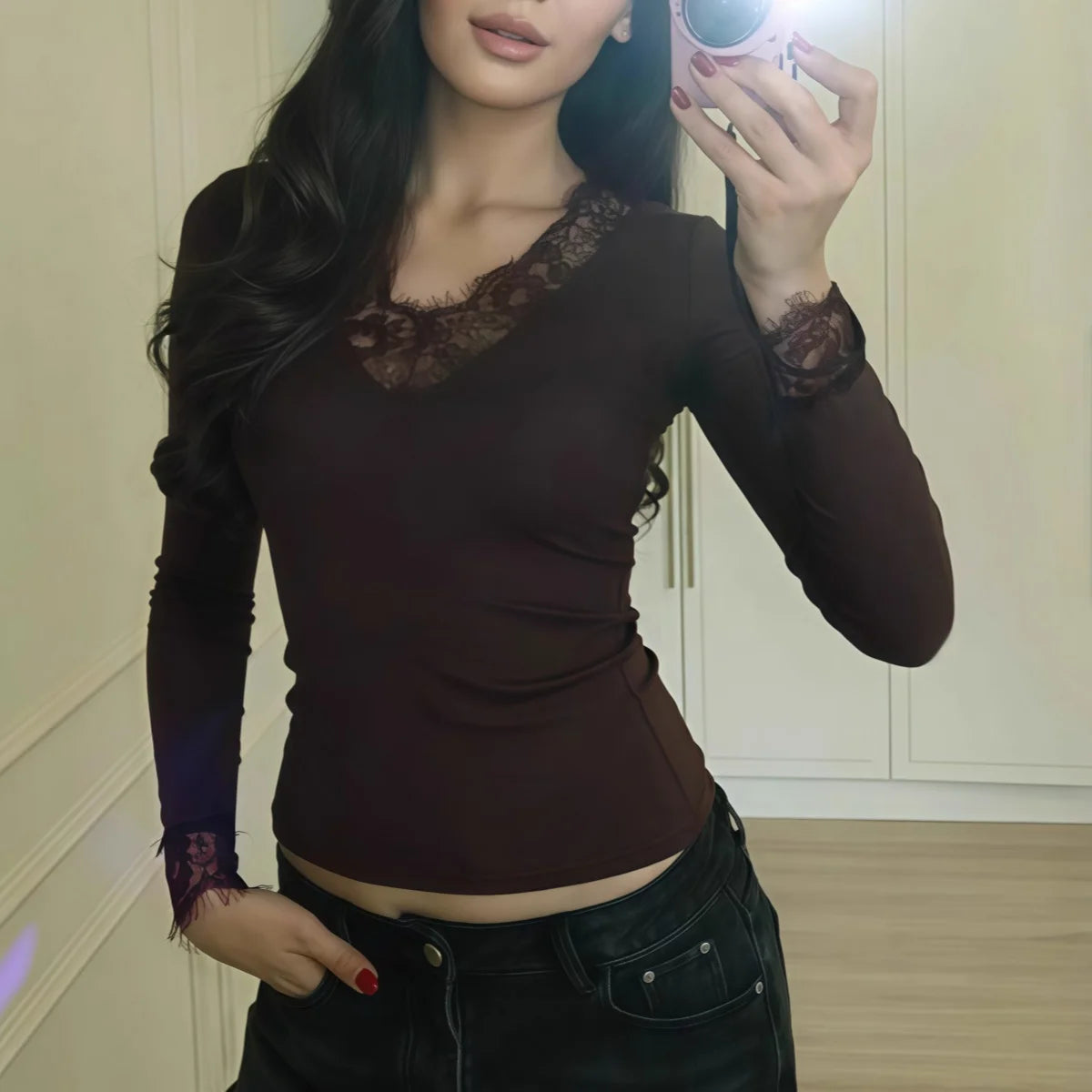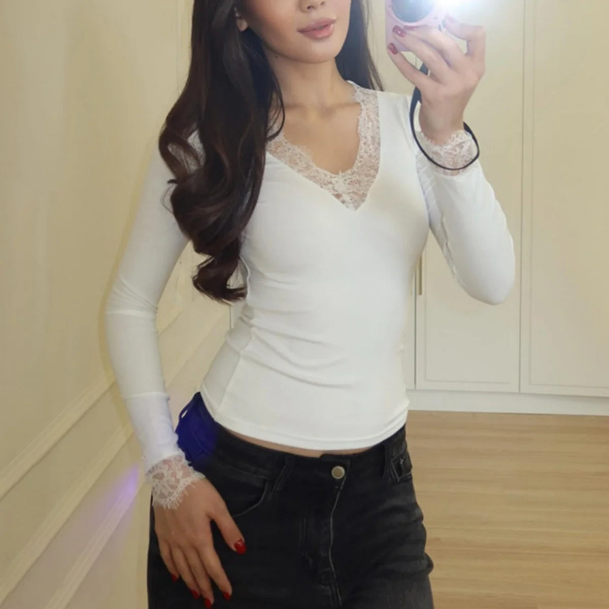 Women Solid Lace Splicing Tee Soft Slim V Neck Sexy Long Sleeve T-shirts Commuting Fashionable Casual Spring Autumn Simple Tops