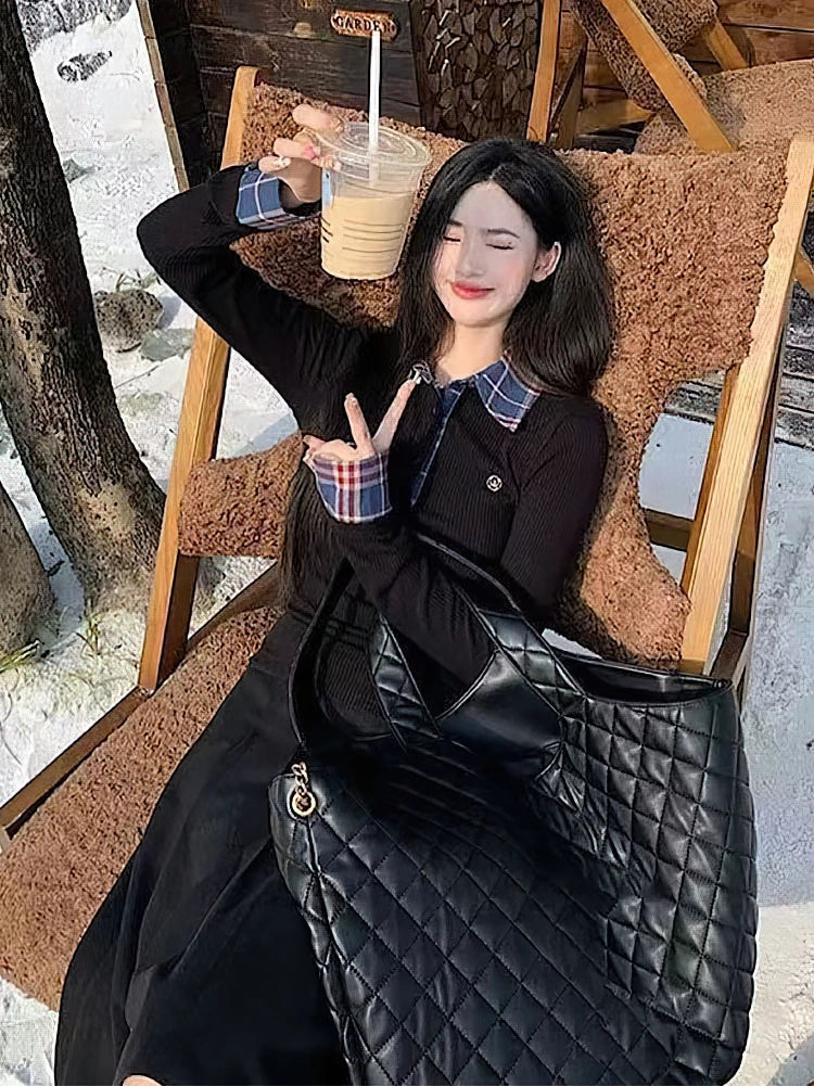 Preppy Polo Neck Knit Plaid Long sleeve T shirt Women False 2 Piece Basic Top V neck Button Blouses Tees 2025 New