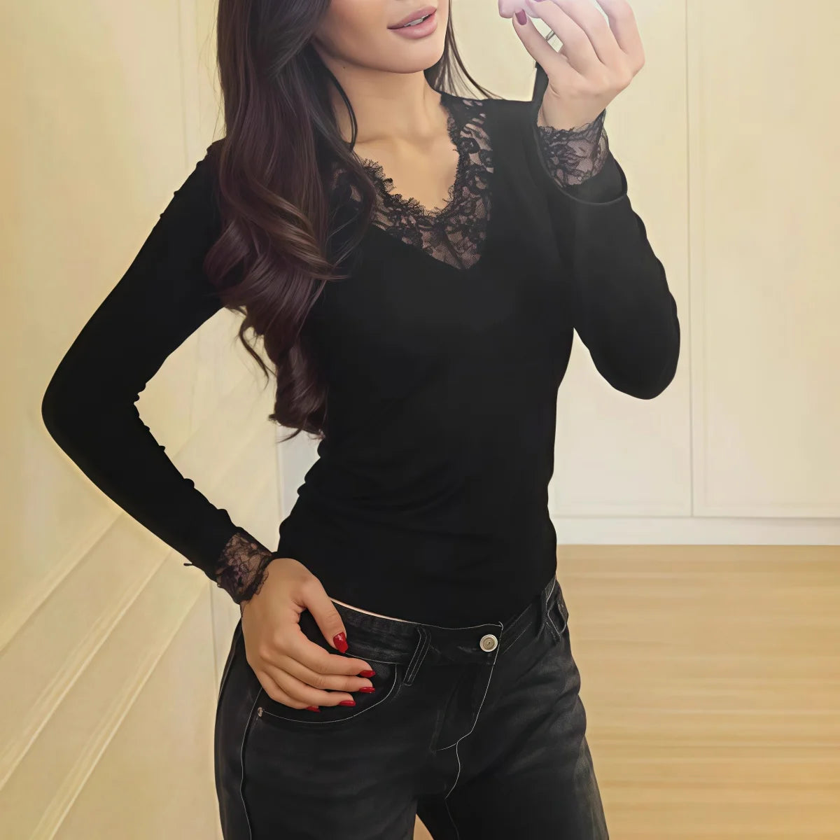 Women Solid Lace Splicing Tee Soft Slim V Neck Sexy Long Sleeve T-shirts Commuting Fashionable Casual Spring Autumn Simple Tops